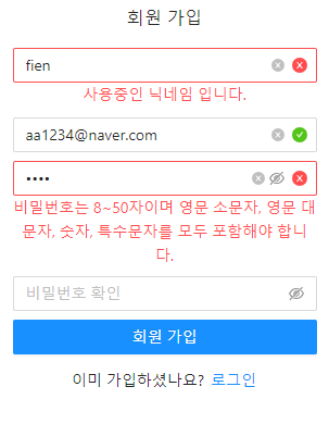 중복인 경우에는 에러 메세지를 보여줍니다. form.setFields([ {name: 'nickname', errors: ['사용중인 닉네임 입니다.']} ]);