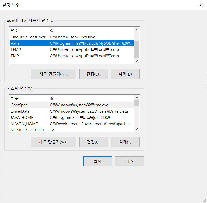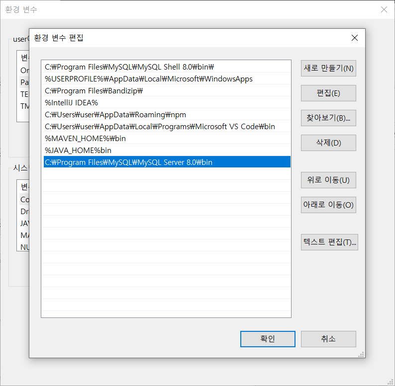 C:\Program Files\MySQL\MySQL Server 8.0\bin 경로를 추가해주면 된다. bin 디렉토리 내에 mysql이 존재하기 때문에 경로에 bin도 포함해야한다.