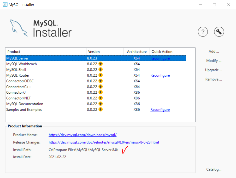 installer를 통해 설치한 경우는 위 처럼 설치 경로를 확인할 수 있다. 디렉토리를 다르게 지정하지 않았다면 보통 C:\Program Files\MySQL\MySQL Server 8.0 위치에 설치된다.